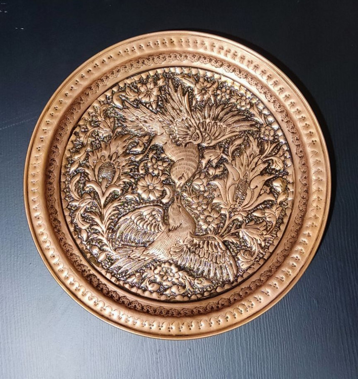سینی مسی قلمزنی طرح گل و مرغ قطر ۳۱ سانت