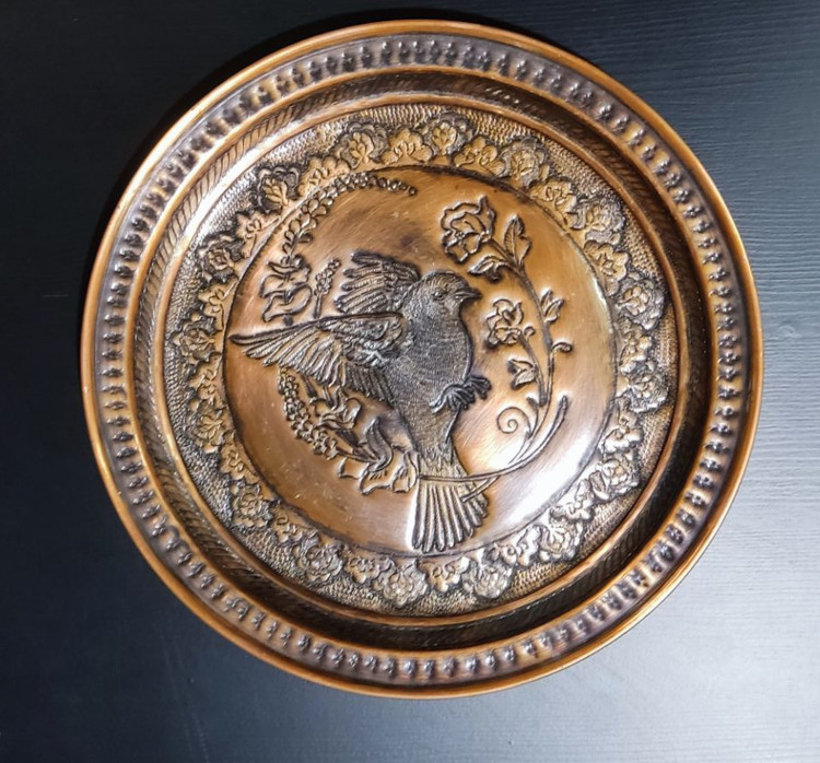 سینی مسی طرح بلبل، قلمزنی تمام کار دست میباشد. قطر ۳۱ سانت، روکش نانو، مس ضخیم به وزن ۹۳۰ گرم